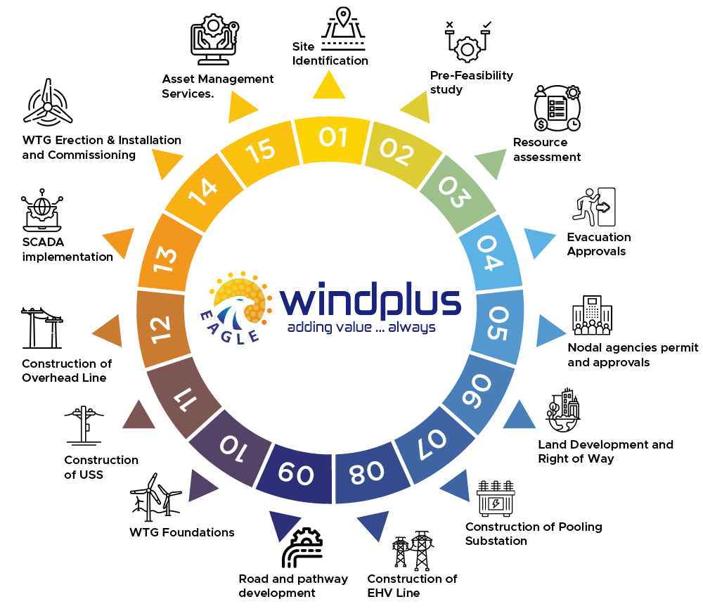 Windplus Eagle, WE provide comprehensive solutions for renewable energy projects across India. Our service focuses on Project development, Project Implementation, Advanced Technical Expertise, and Effective Asset Management, ensuring successful execution and long-term viability of renewable energy, with a deep sense of responsibility.